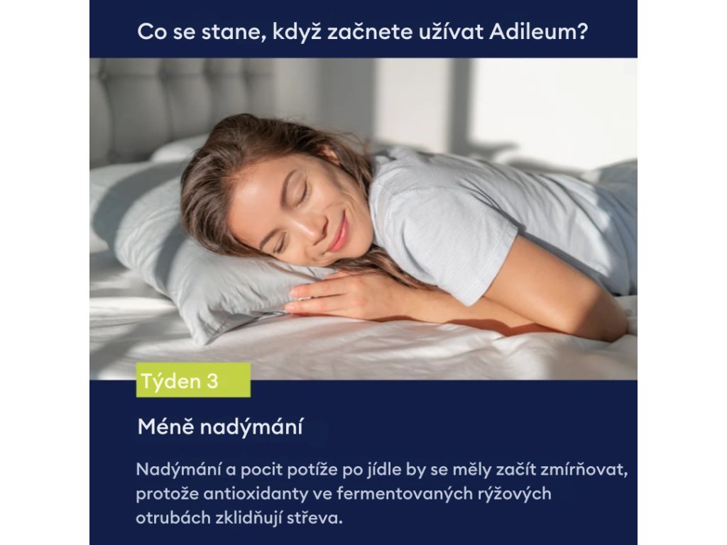 Název: Doplněk stravy adileum. Obsahuje metabolity z fermentovaných rýžových otrub, které mohou uklidnit podrážděný žaludek a přispět ke zlepšení kvality života, celkové pohody a zdraví. Neobsahuje lepek, mléčné výrobky ani sóju.